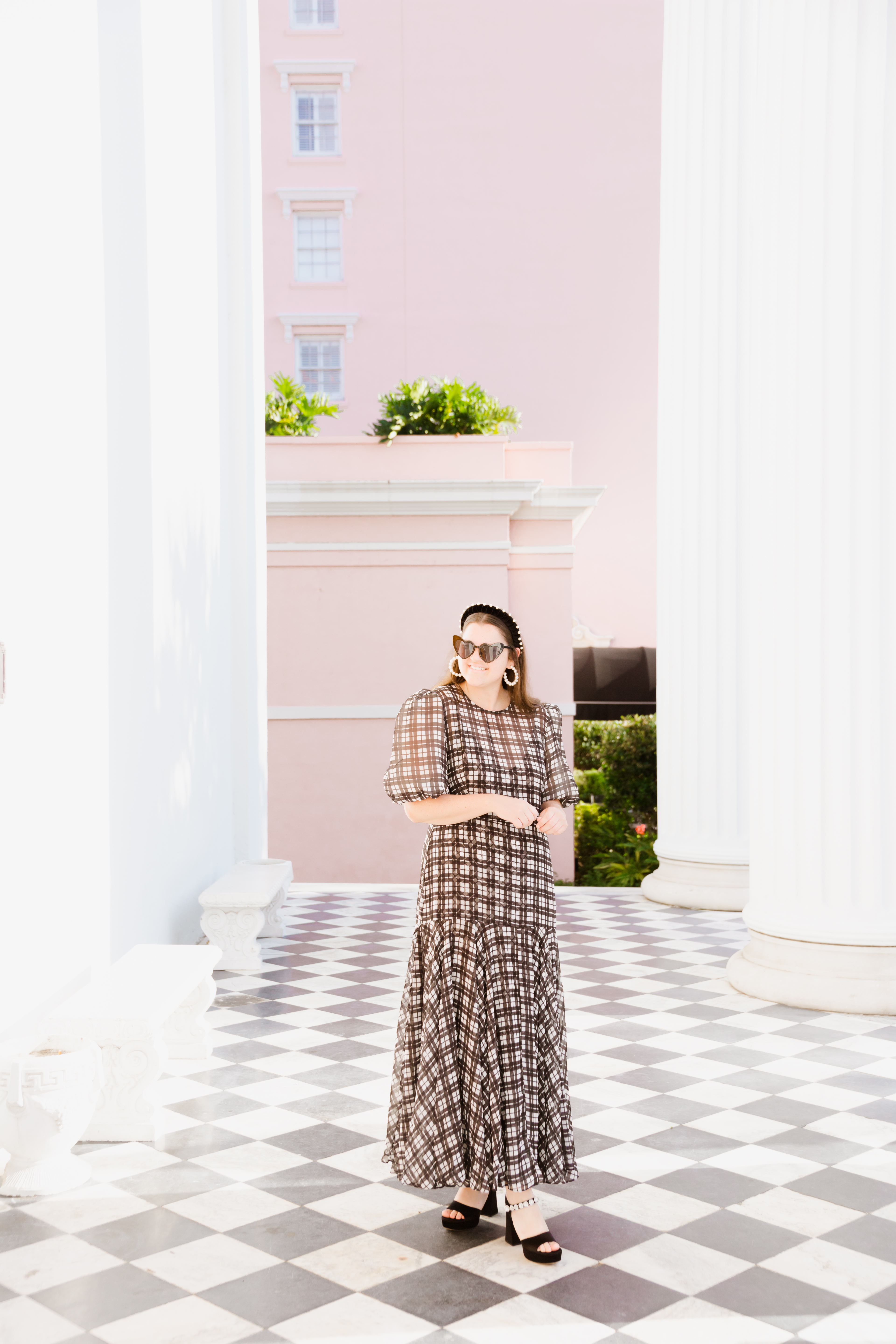 What a perfect background you’ve chosen for that dress! The dress is just gorgeous and I love that you’ve accessorized with the pearl-accented shoes, headband and earrings (and the cute heart-shaped sunnies).