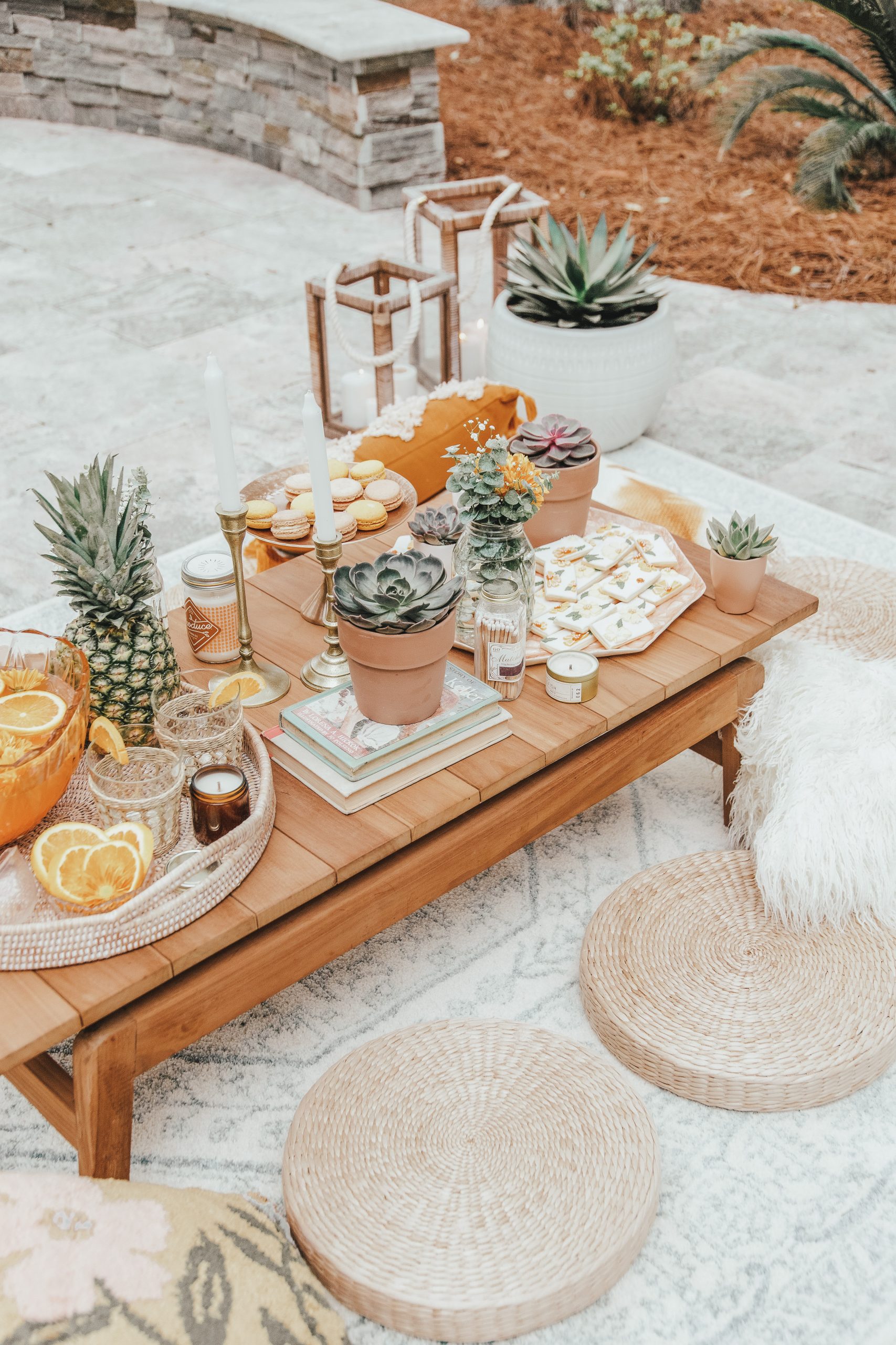 Table: Target | Rug: Target | Seat Cushions: Amazon | Pillows: Urban Outfitters and Anthropologie | Rattan Serving Tray: Amazon | Candle Sticks: Target | Cake Stand: Anthropologie (similar) | Drinking Glasses: Pottery Barn | Candles: Candlefish | Cookies: The Frosted Palmetto | Photography: Kim Graham Photo