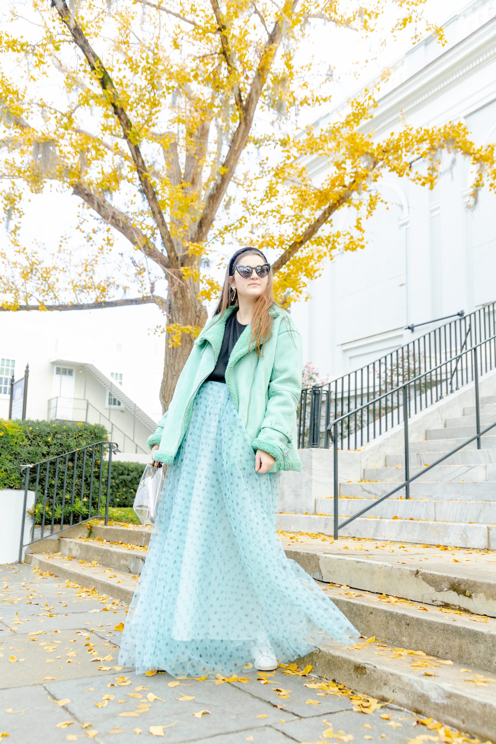 As I was walking out the door to take these photos, I randomly grabbed this mint coat that I hadn’t worn in a while. Fast forward and this look is now one of my absolute favorites!! Somehow, this over the top blue skirt pairs perfectly with my oversized mint coat and sneakers. After breaking out this number and dusting it off for the first time this season, mint became my color crush and obsession. Mint isn’t normally in my fall/winter color palette, but I’ve been loving brighter colors during the colder months lately.