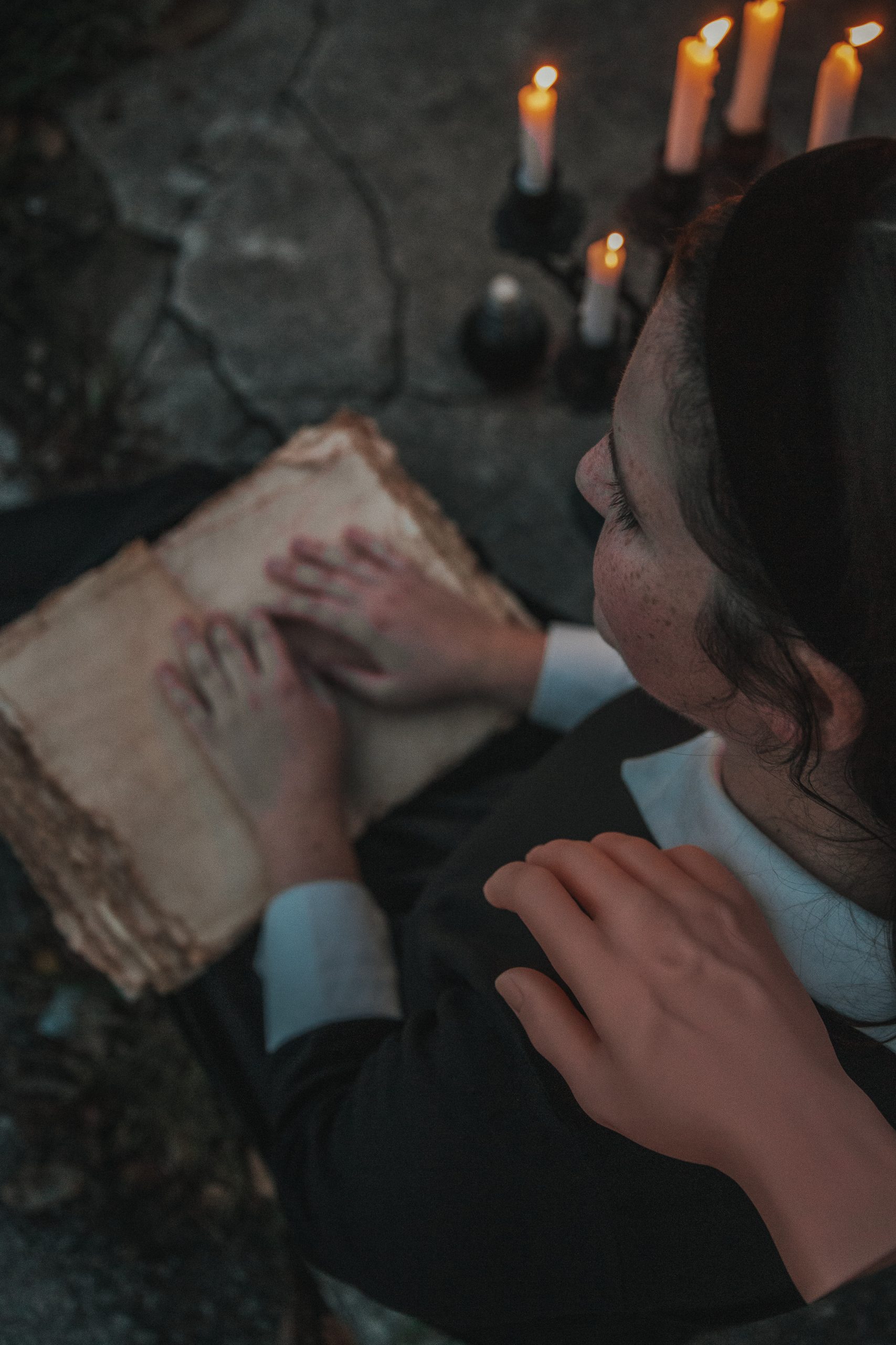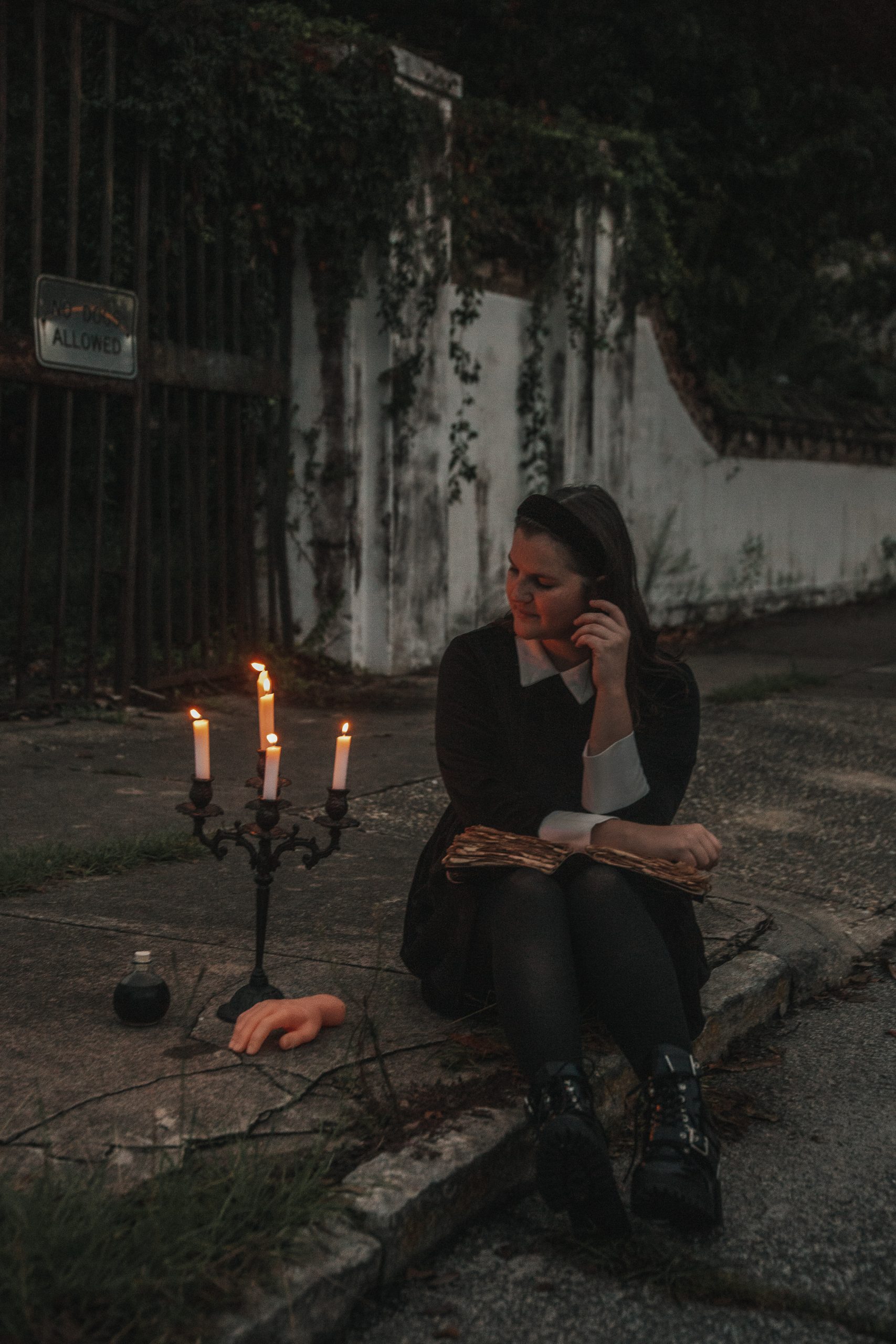 Dress: Amazon | Shoes: Nasty Gal | Tights: Nordstrom | Headband: Target | Candelabra: Amazon | Fake Hand: Amazon | Skull: Amazon | Vintage Journal: Amazon | Photography: Kim Graham Photo