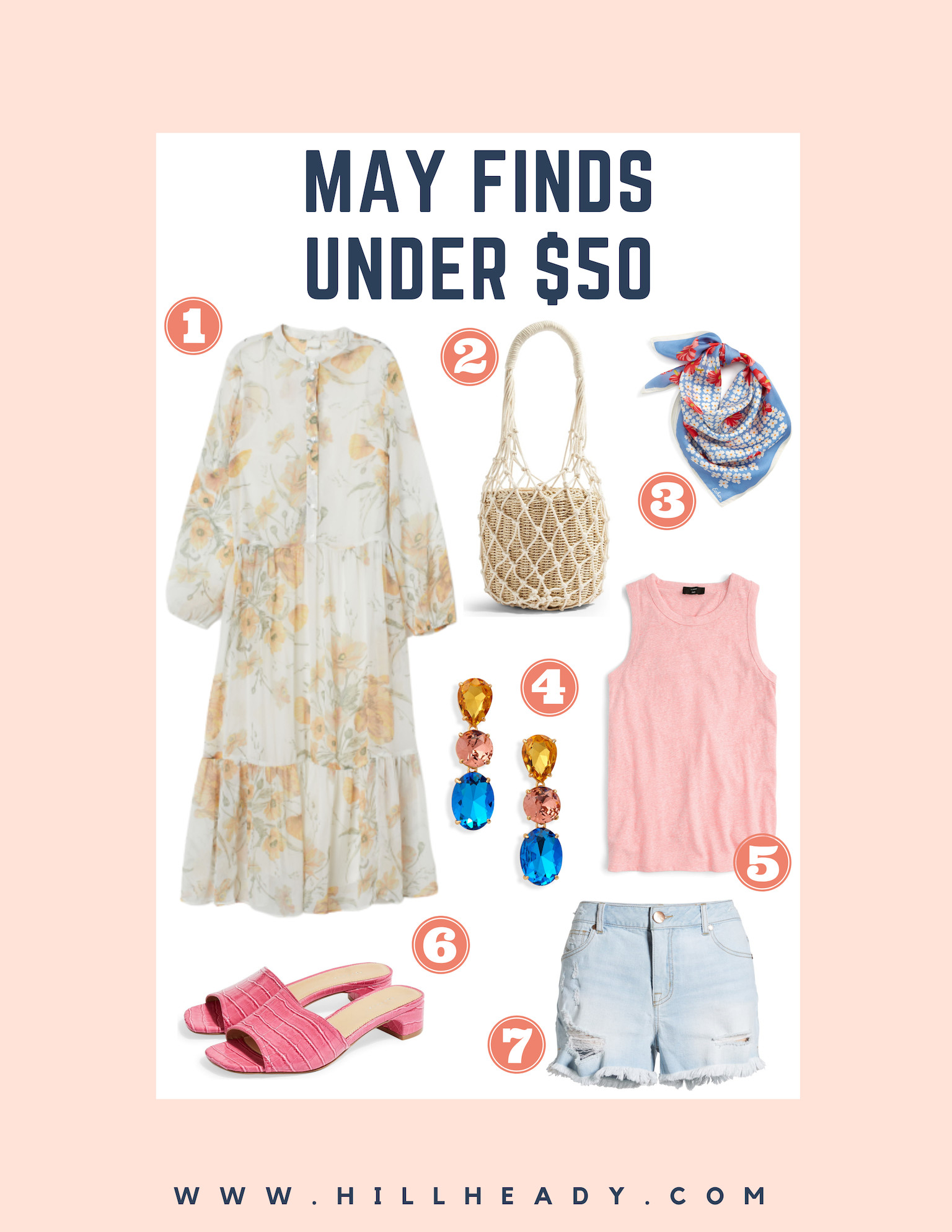 1. Floral Midi Dress | 2. Basket Tote | 3. Floral Silk Scarf | 4. Stone Drop Earrings | 5. Tie-Back Tank Top | 6. Pink Sandals | 7. Denim Shorts