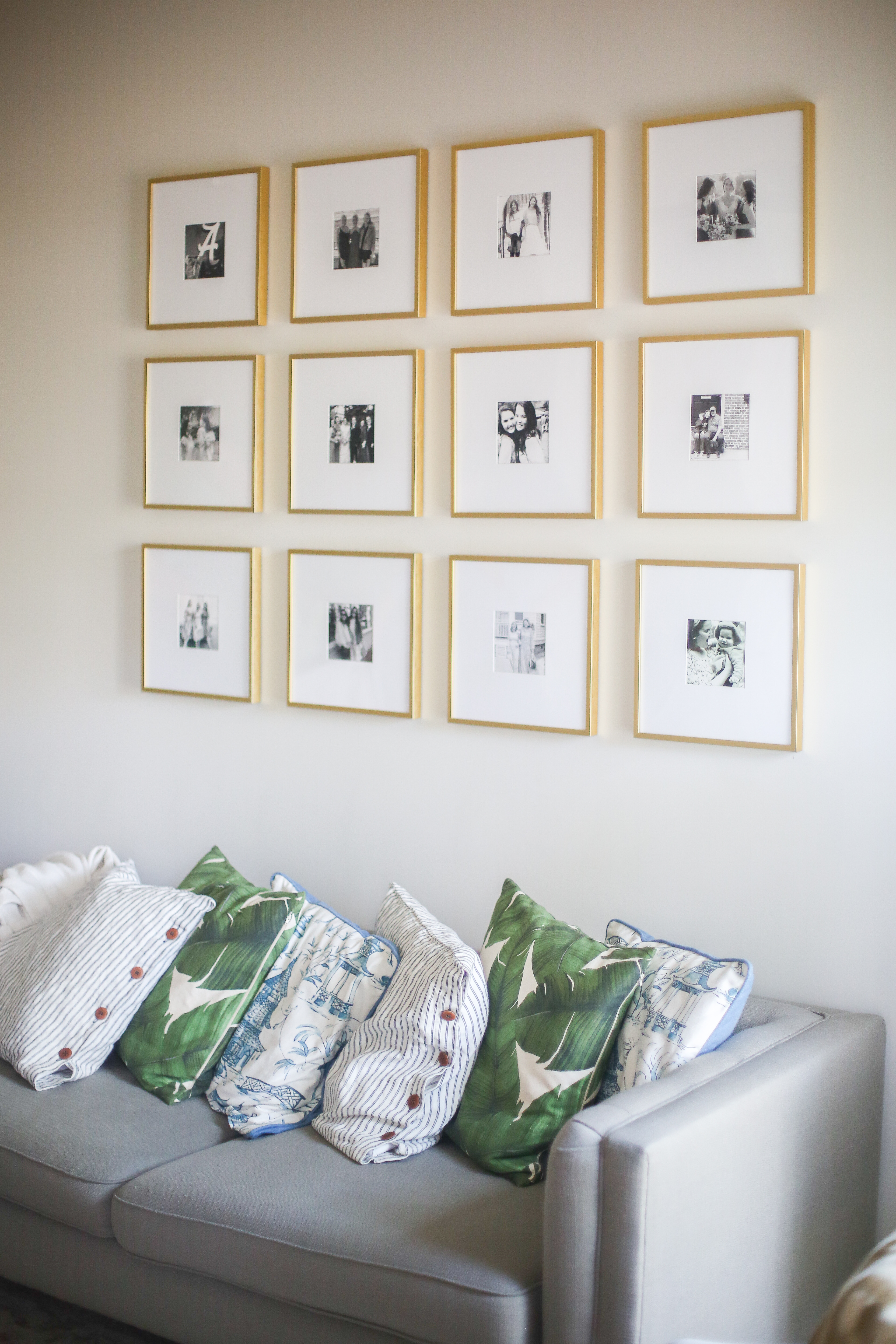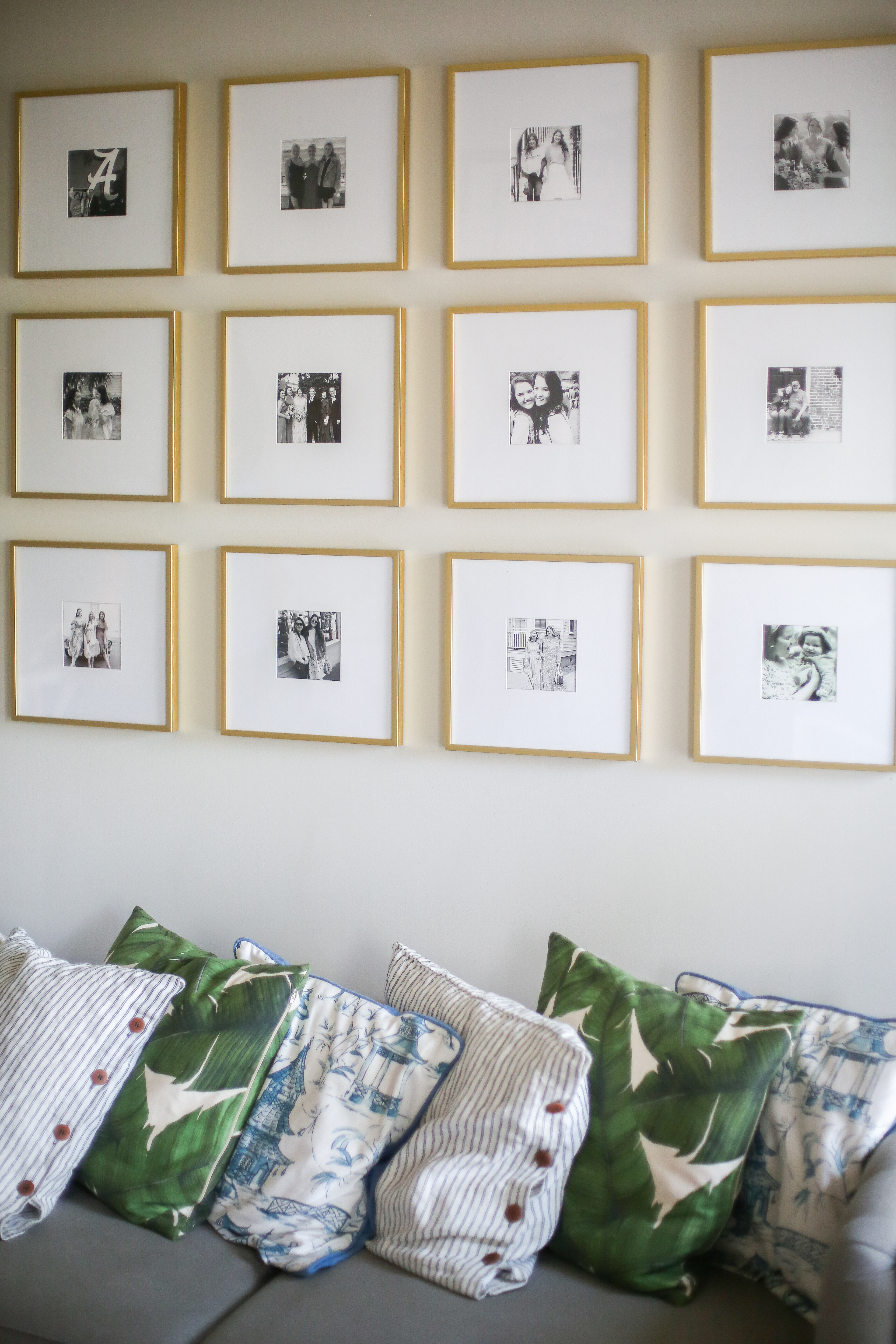 This week, my parents and I worked together to hang the whole gallery. Our first step, of course, was assembling the frames. You can tell the quality of these frames are amazing which was really important to me! The gold is beautiful and really makes a statement. While we were putting the photos in the frames, we also cut out cardboard in the shape of the frames to plan out how we wanted to hang it. I definitely recommend doing this whether it’s with cardboard or newspaper that you can tape on the wall. Now it was time to hang! The first row is for sure the hardest as you’re trying to getting it all even in a straight line. Thankfully, Frame It Easy sends everything you need for this process. Once we got the first row hung, it was smooth sailing! We measured up from each hook to create the second and third rows – each frame was about 12 inches tall and wide and I knew I wanted 3 inches in between each frame. So we measured up 15 inches and that’s where each nail went.