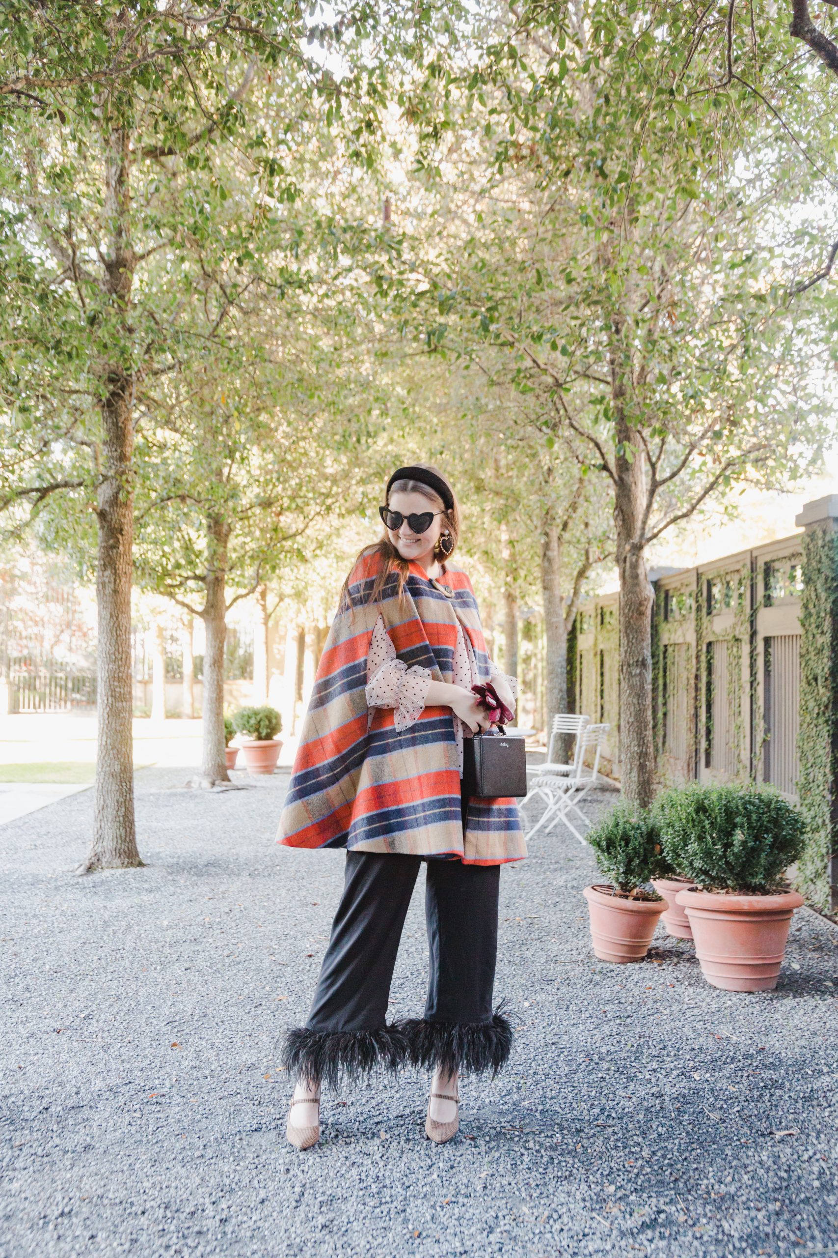 Top: Nordstrom | Pants: Sleeper | Cape: Nasty Gal | Shoes: Nordstrom | Bag: Pop & Suki | Headband: Nordstrom | Earrings: Bauble Bar | Sunglasses: Amazon | Photography: Kim Graham Photo